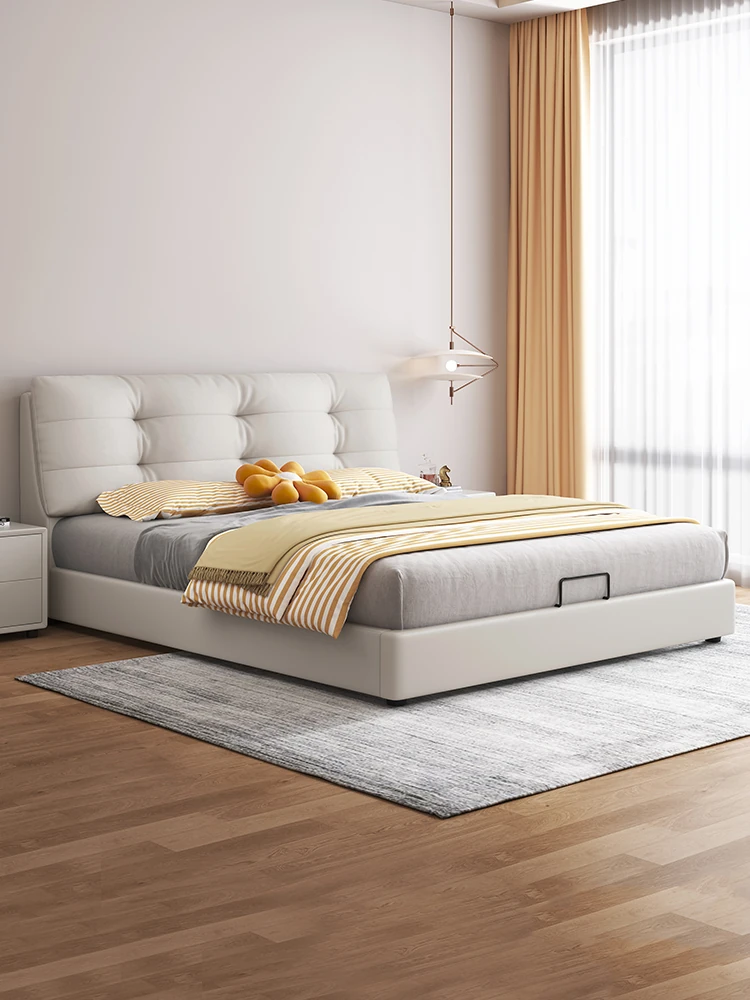 French Cream Cloud Bed - Modern Minimalist Luxury Leather Bed for Small Spaces, Double Size Soft-Packed Bed for Master Bedroom, Ideal for Newlyweds