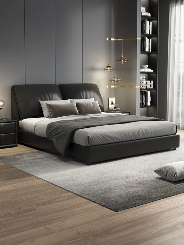 2025 New Italian Minimalist Genuine Leather Bed - Luxurious Modern Double Bed for Master Bedroom, Soft-Padded Design Ideal for Couples