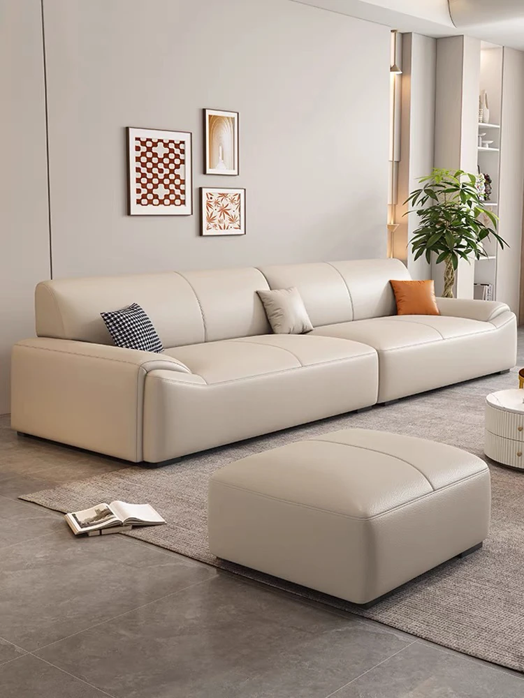 Italian Minimalist Genuine Leather Sofa for Small Living Rooms - Modern Simple Design, Straight Double and Triple Seat, Cat Scratch Resistant Upholstery