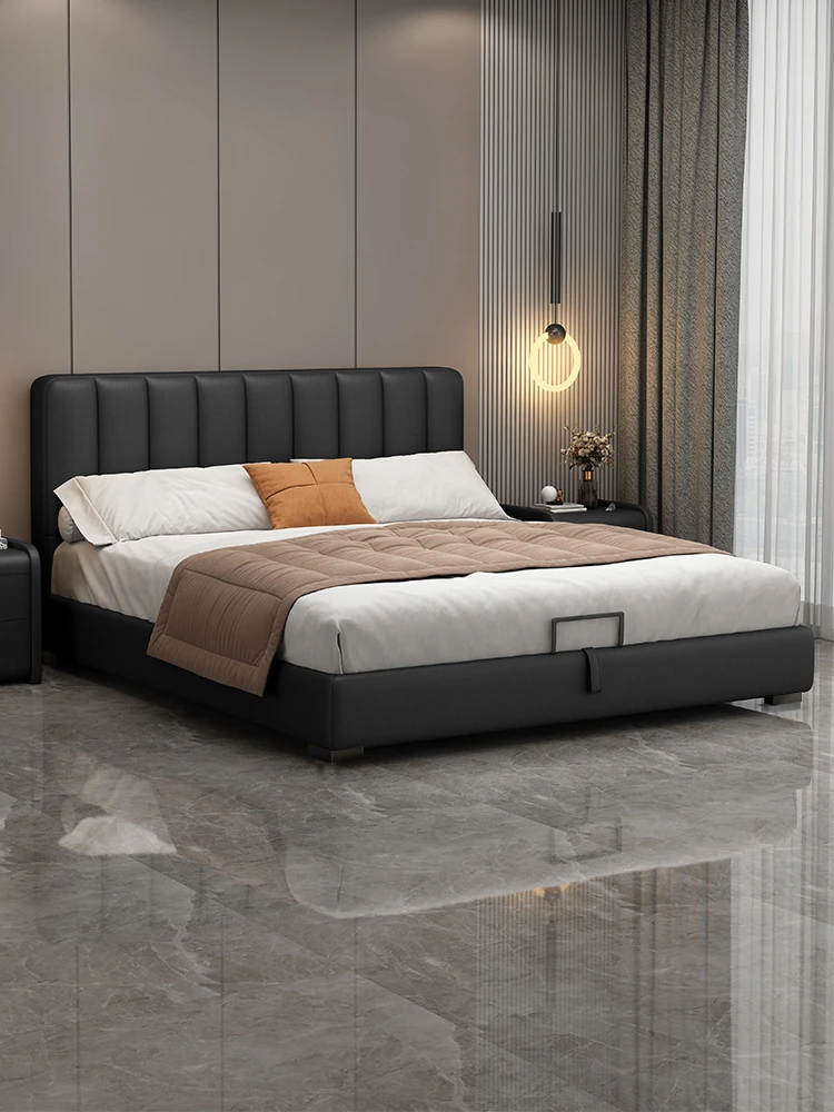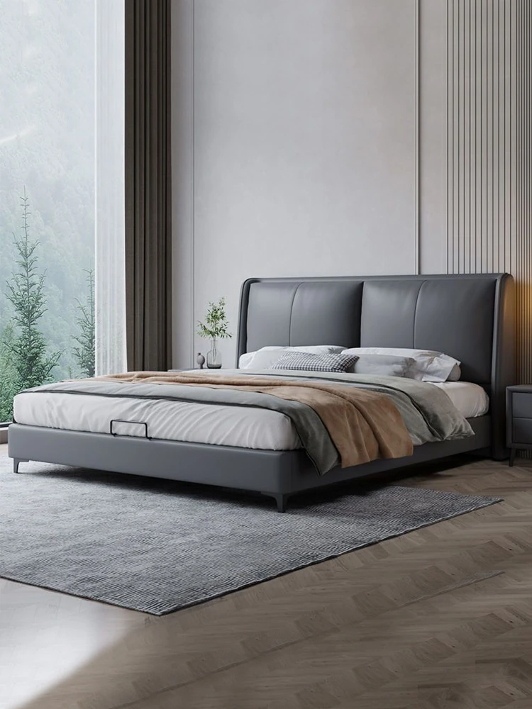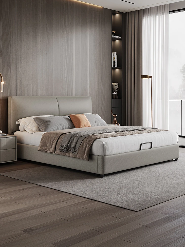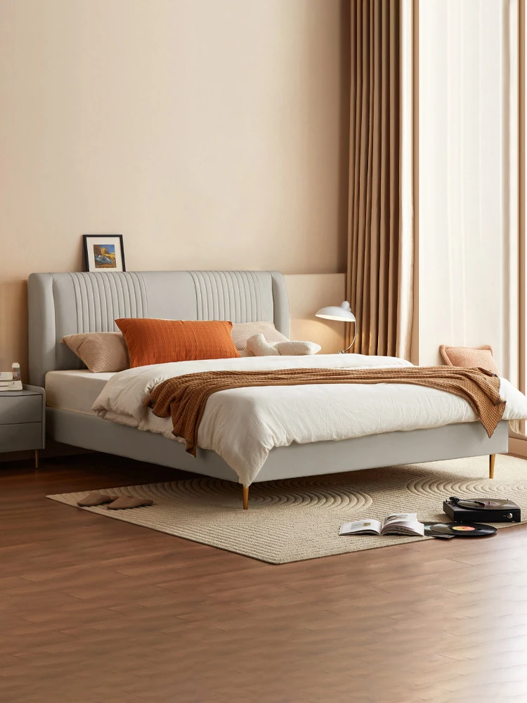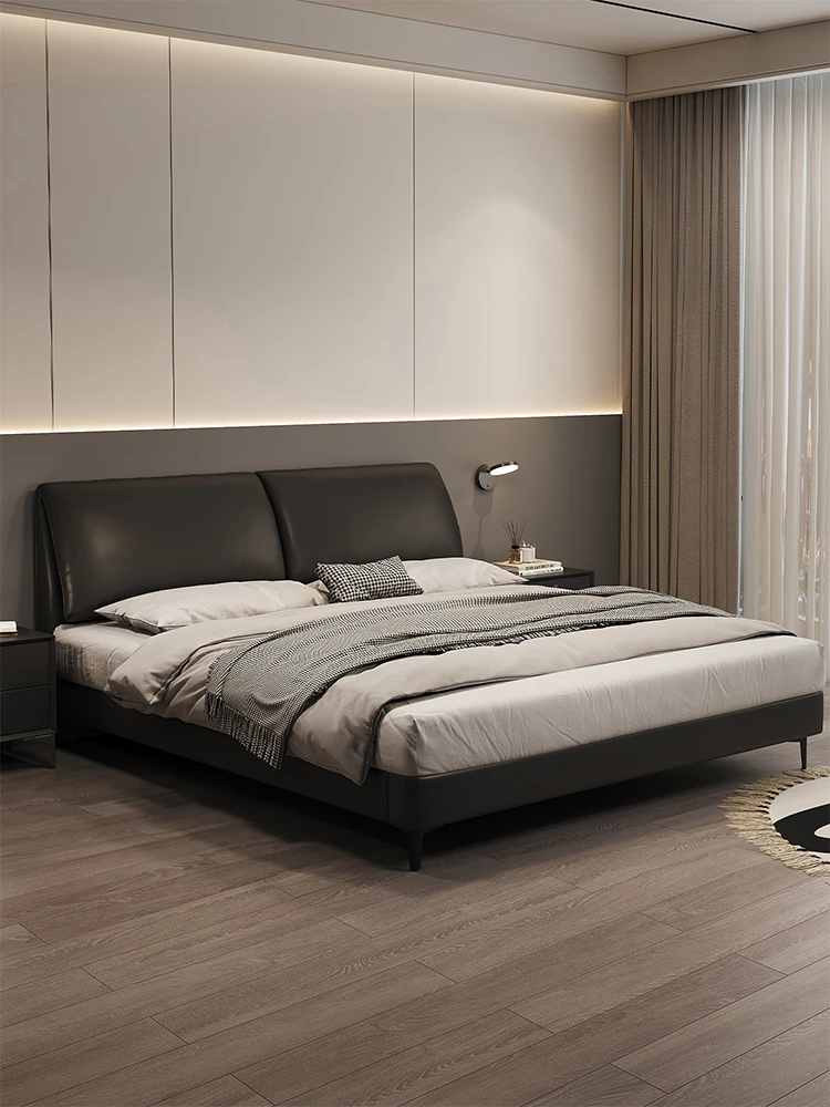 Nordic Luxury Leather Upholstered Bed - Modern Minimalist Double Bed for Master Bedroom, Premium Genuine Leather with Solid Wood and Soft Padding, Perfect for Newlyweds
