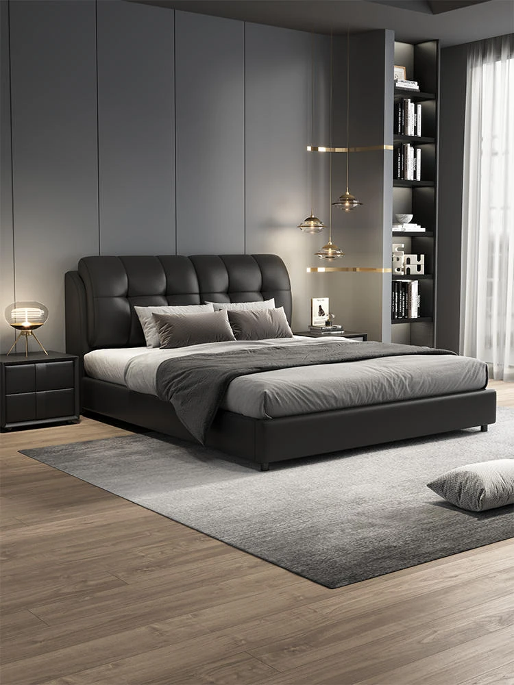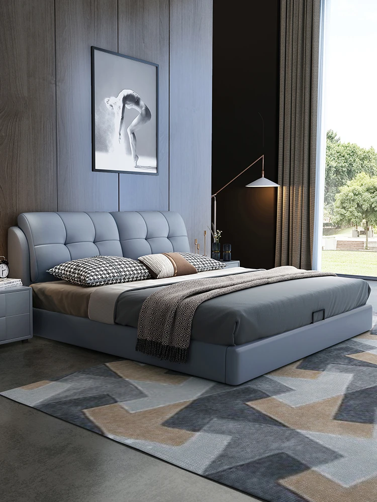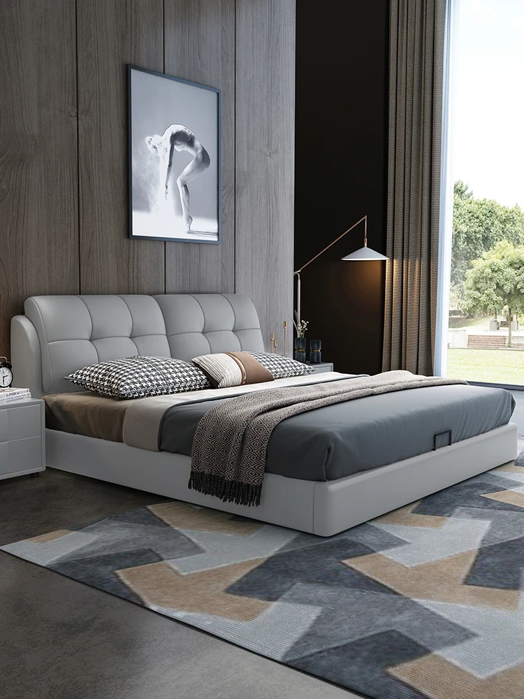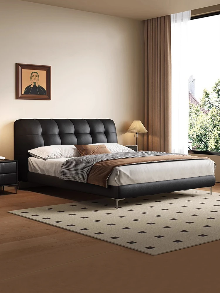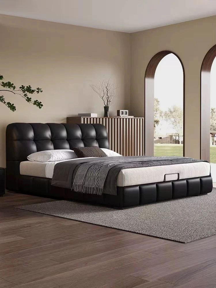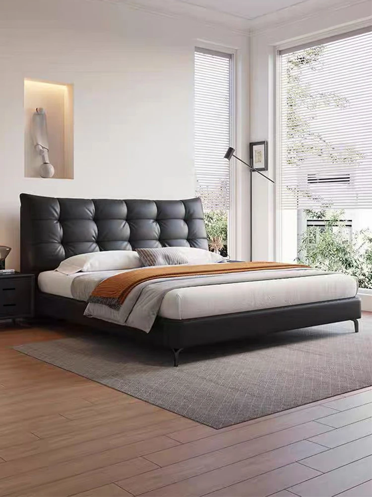 Luxury Puff Bed for Master Bedroom - Elegant 1.5m/1.8m Genuine Leather Double Bed, Modern Minimalist Soft Upholstered Wedding Bed