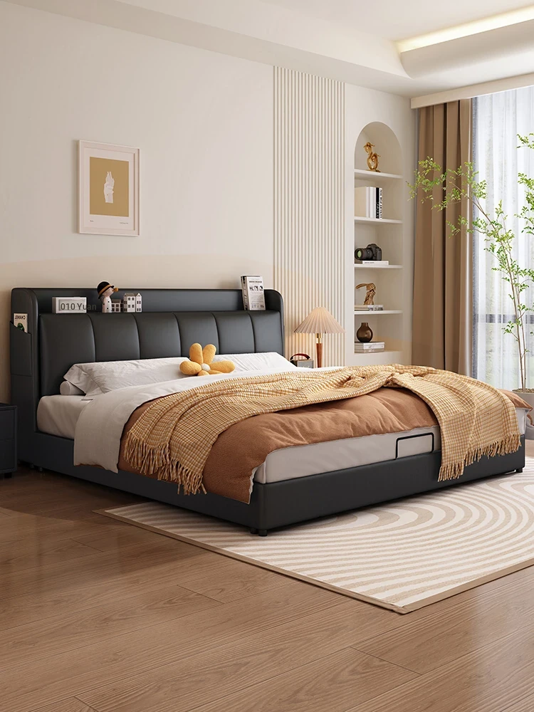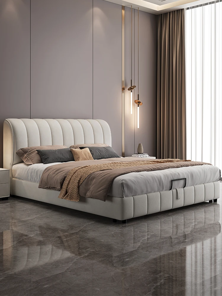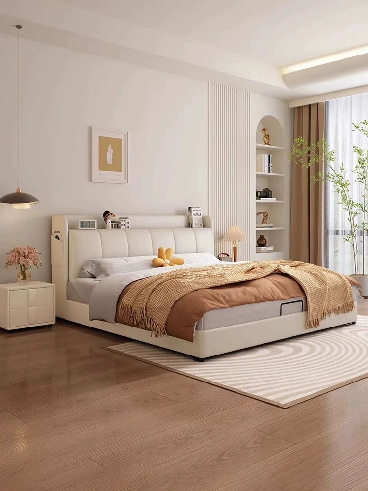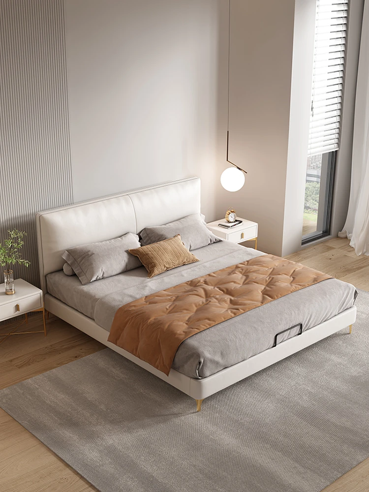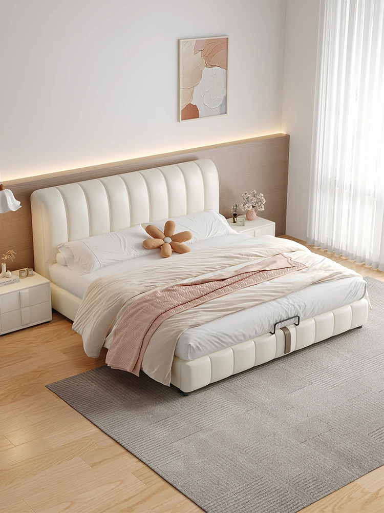 French Cream Style 2025 New Modern Minimalist Genuine Leather Bed for Master Bedroom - High-End Elegant Soft-Padded Double Bed