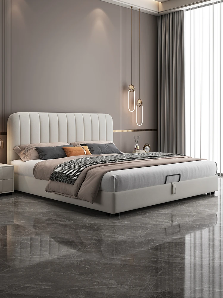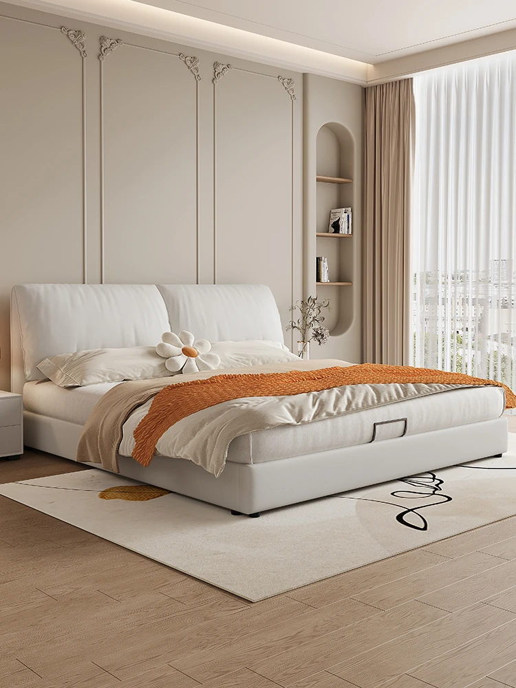 Modern French Style Cream Leather Double Bed with Soft Upholstery - Elegant Solid Wood Storage Bed for Master Bedroom, Perfect Blend of Luxury and Minimalism