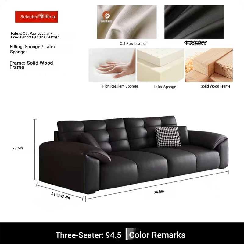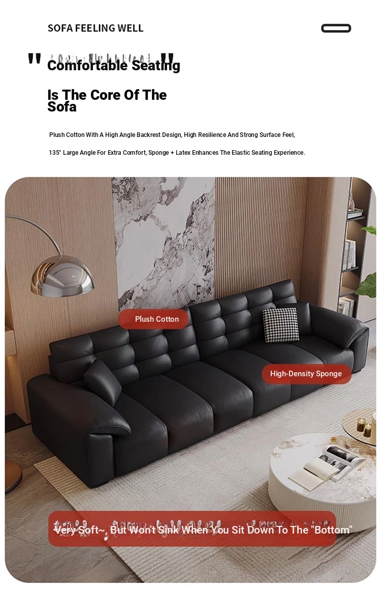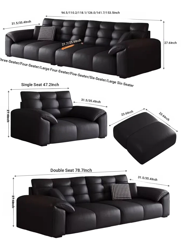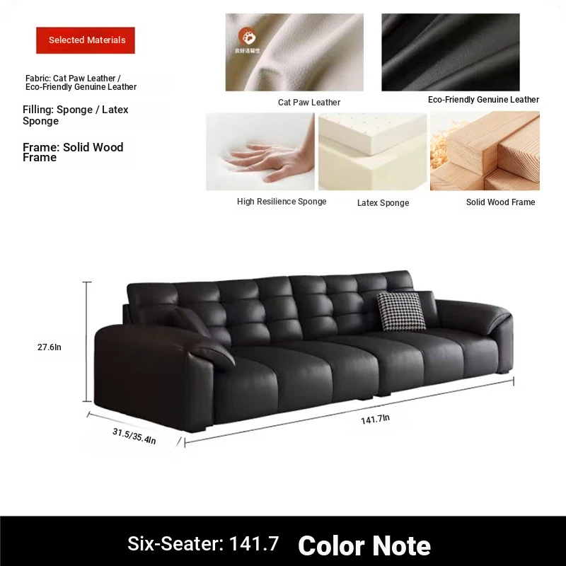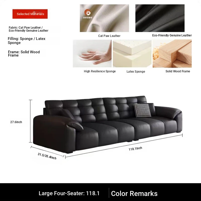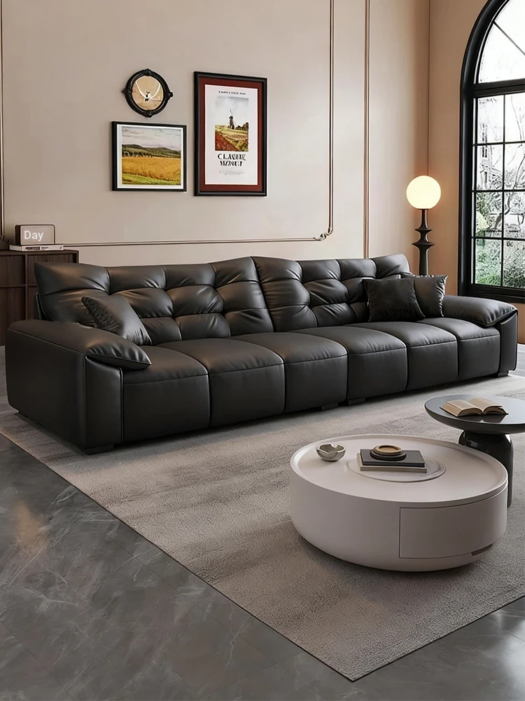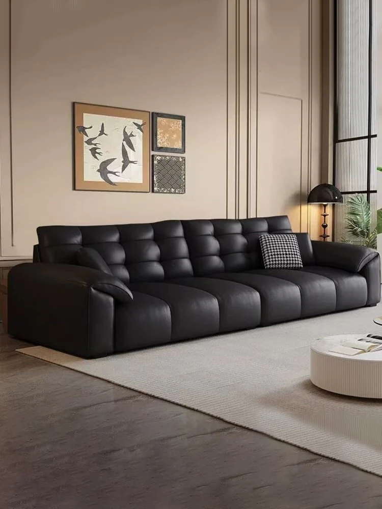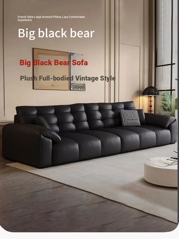 Italian Minimalist 2025 New Large Black Bear Genuine Leather Sofa - Luxurious Straight Four-Seater for Living Rooms of All Sizes, Perfect for Modern Homes