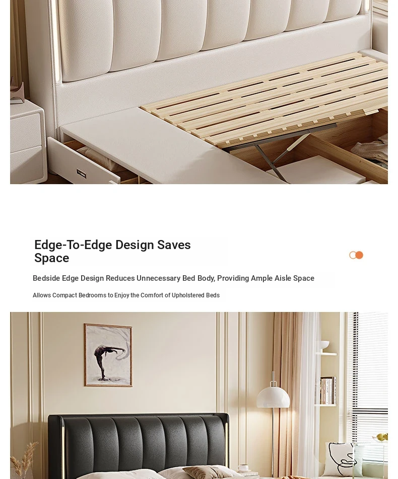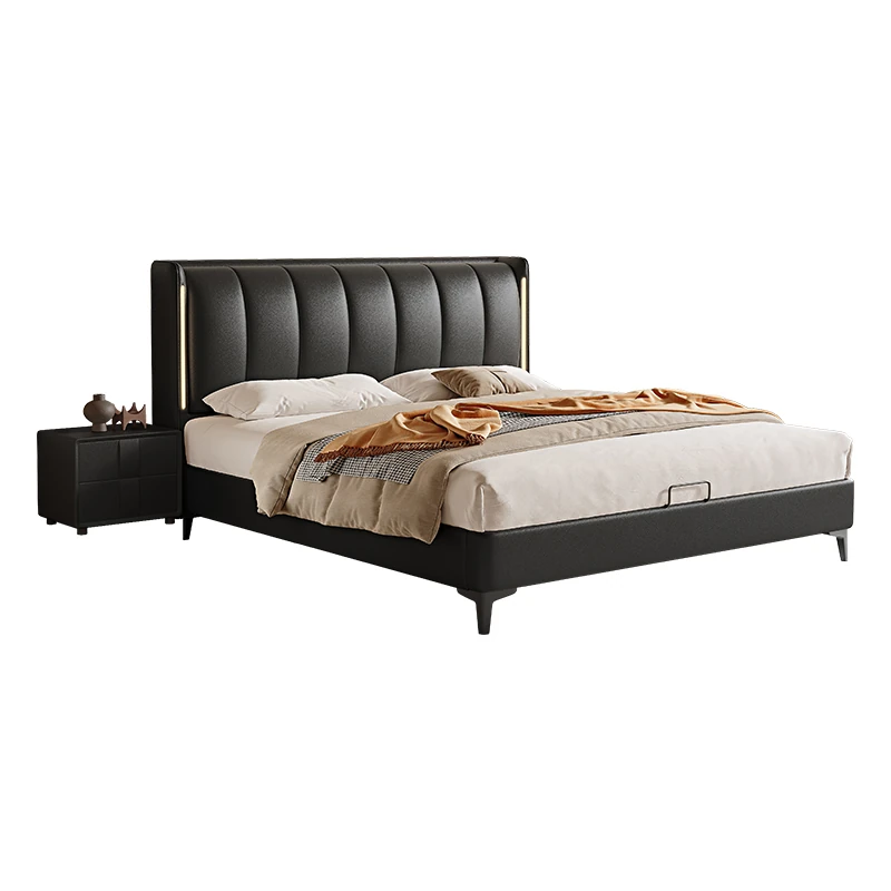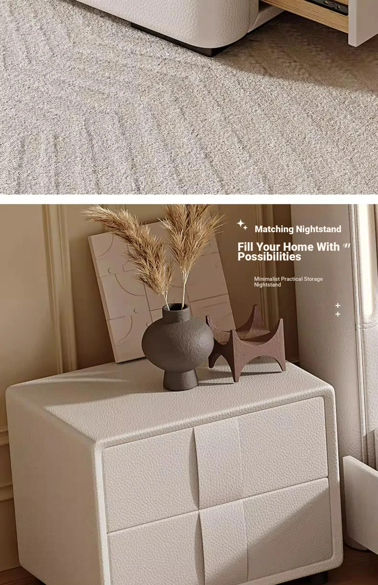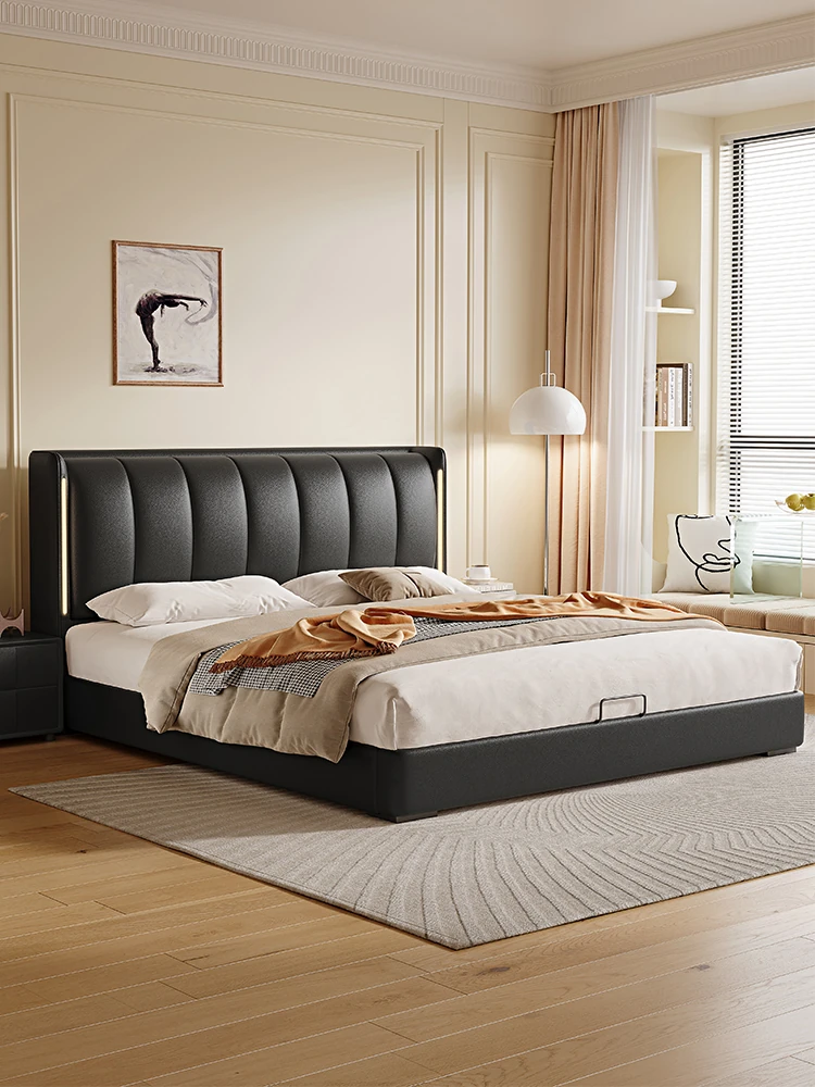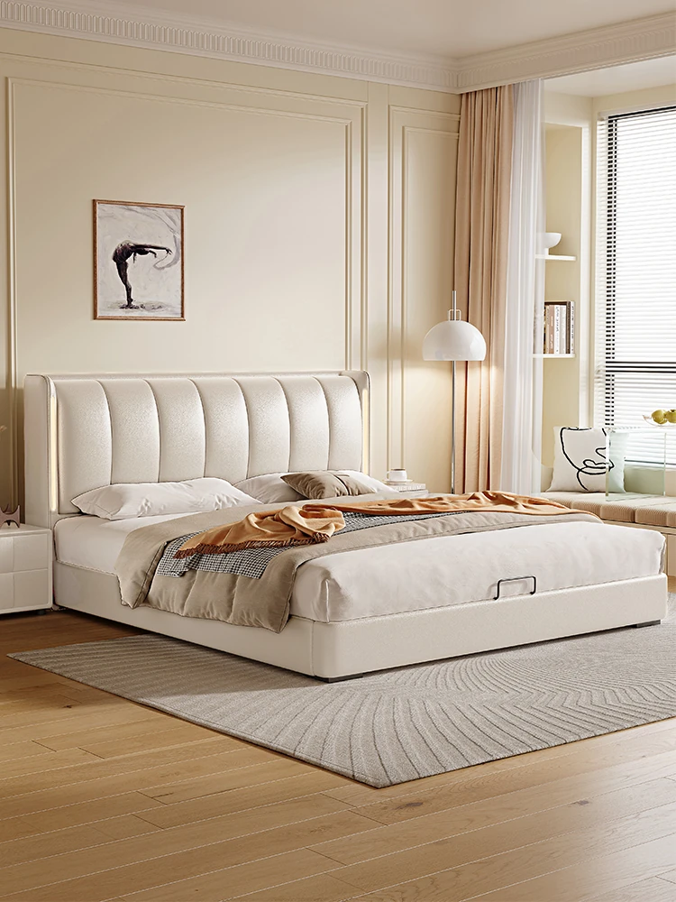 Luxurious Modern Cream Leather Double Bed with Soft Upholstery and Solid Wood Frame - Perfect for Master Bedrooms, Elegant Design with Integrated LED Lighting, Ideal for Newlyweds.