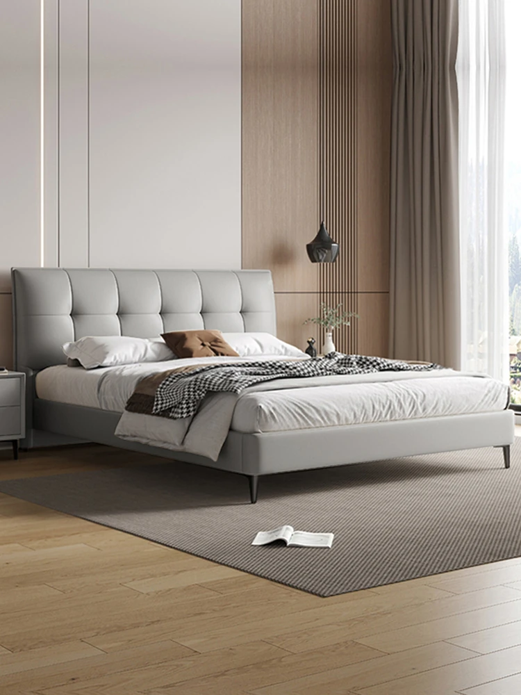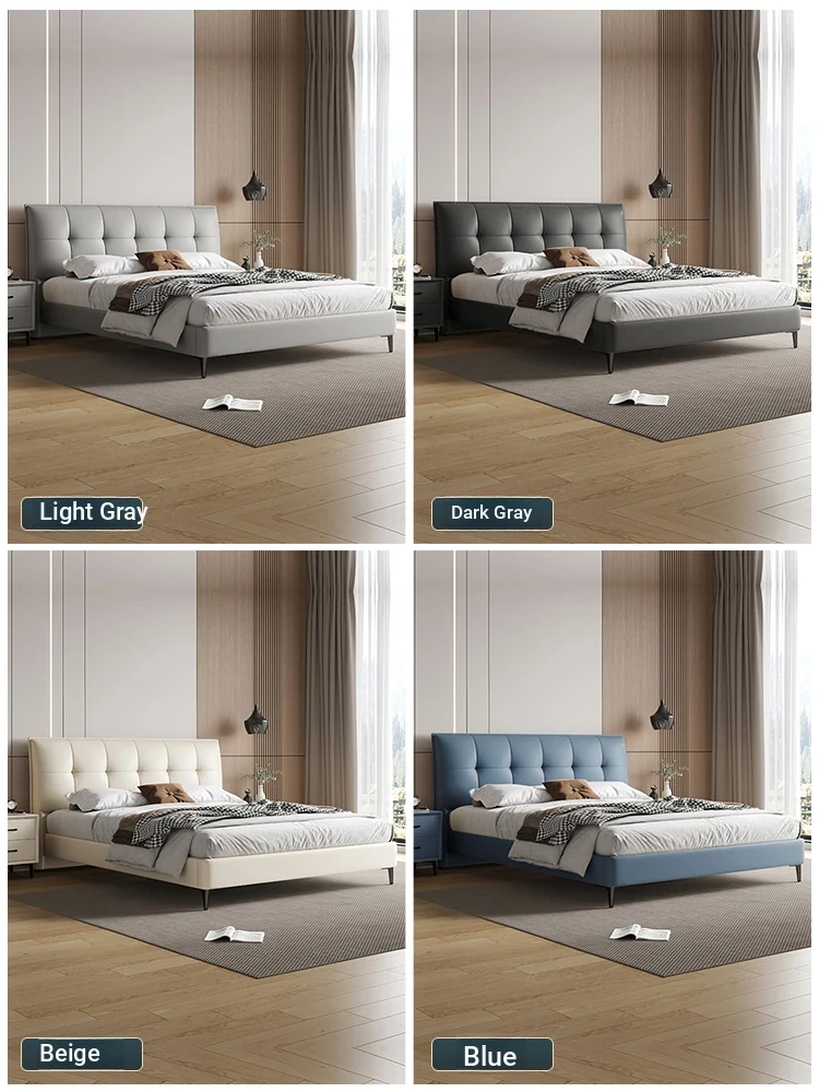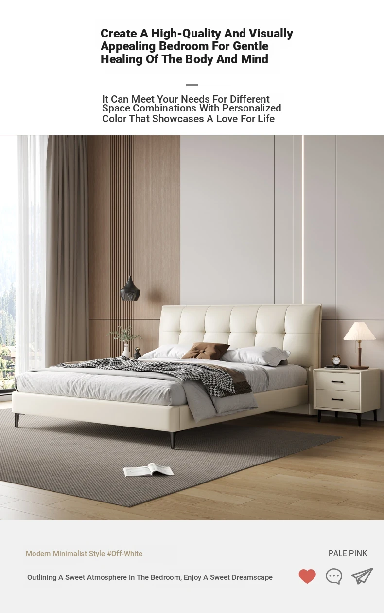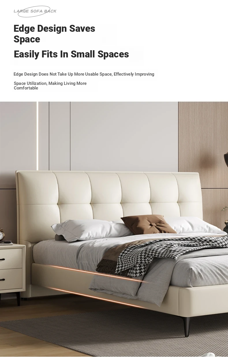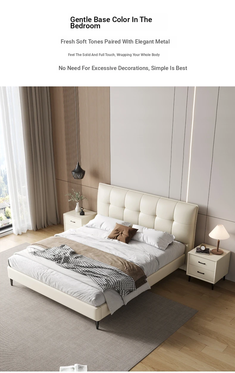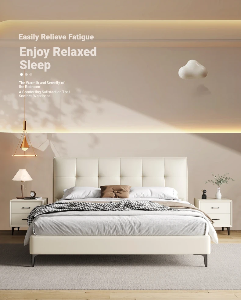 Modern French Cream Upholstered Double Bed - Luxurious and Elegant Leather Bed for Master Bedroom, Soft and Stylish Design, 1.5m Size, Perfect for a Chic Living Space.