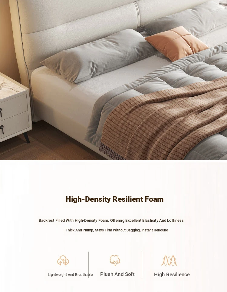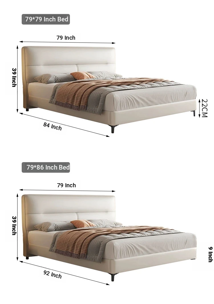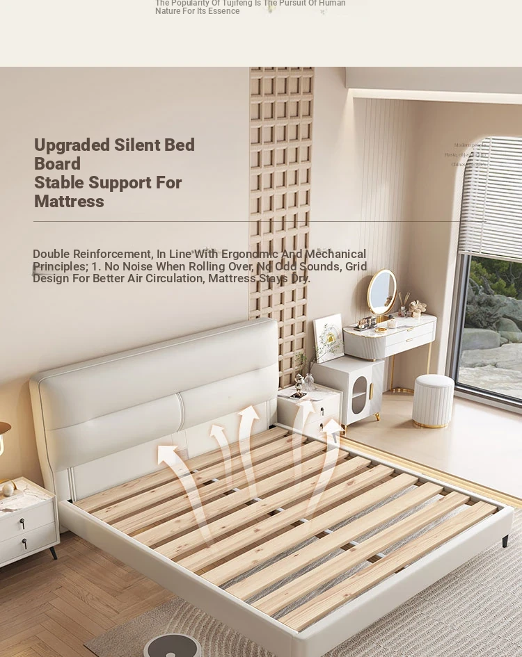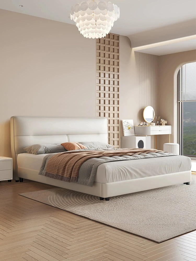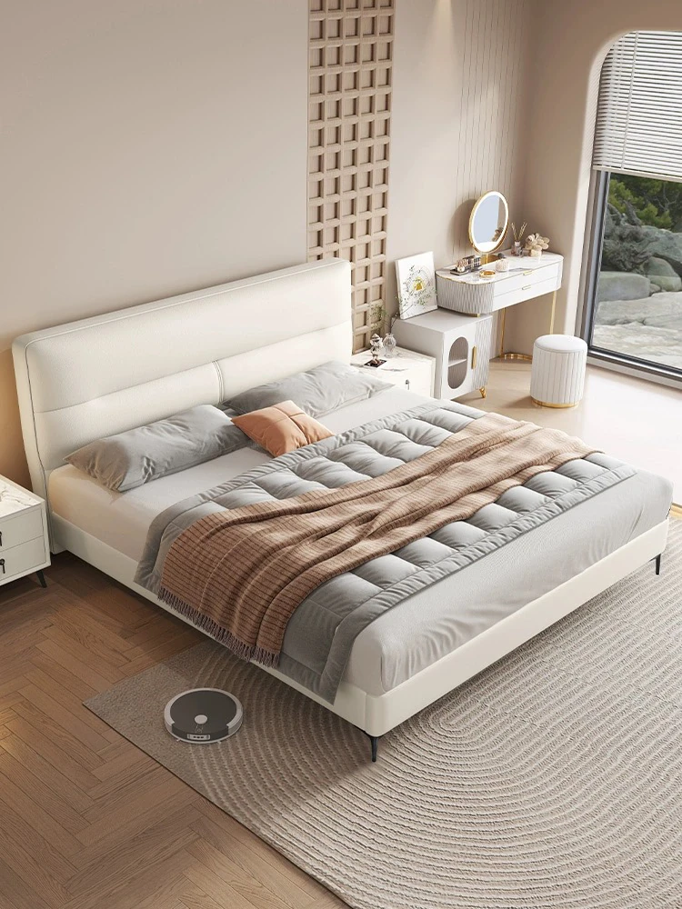 Nordic Luxury Faux Leather Bed - Modern Minimalist Double Bed for Master Bedroom, High-End Genuine Leather Design, Solid Wood Frame with Soft Upholstery, Perfect for Newlyweds