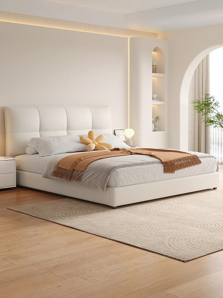 French Cream Style 2025 New Modern Minimalist Genuine Leather Bed for Master Bedroom - High-End Elegant Soft-Padded Double Bed