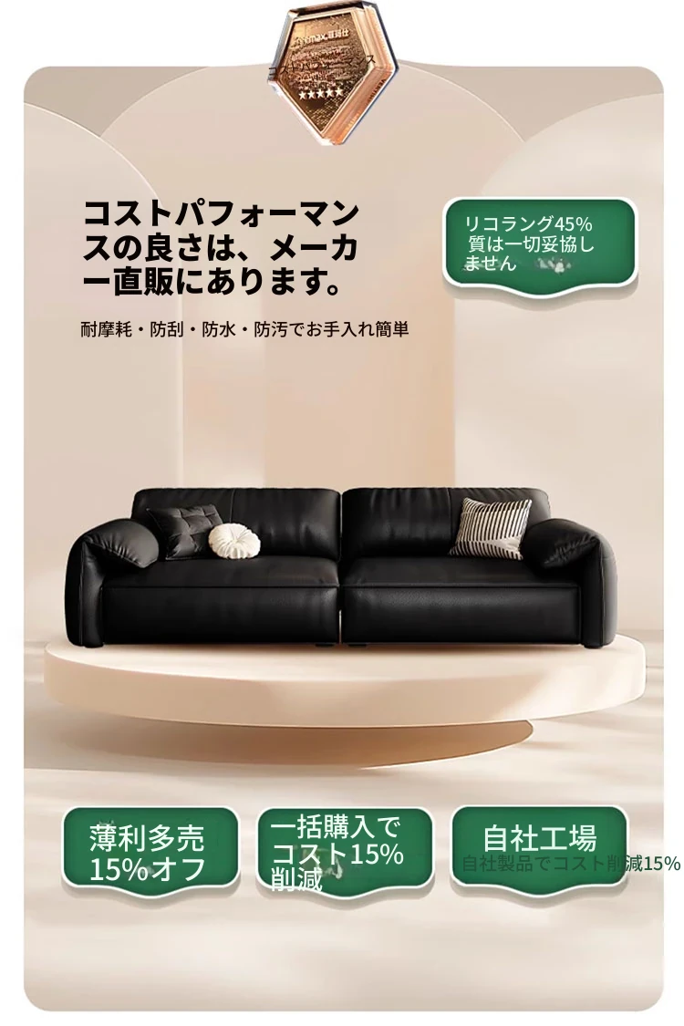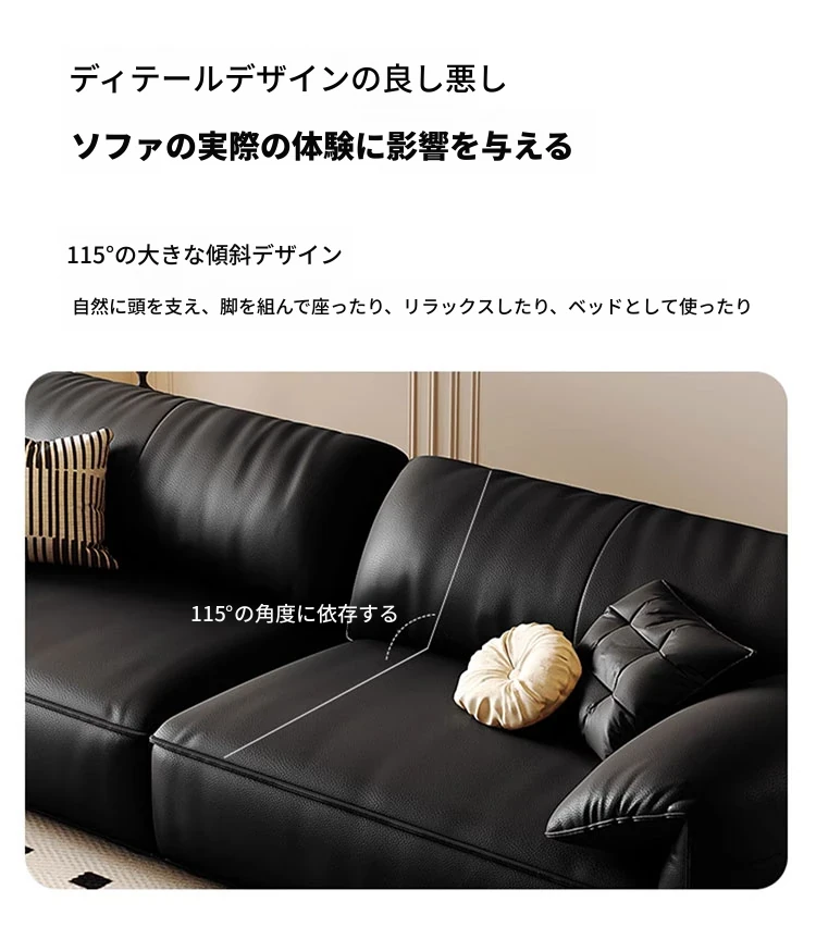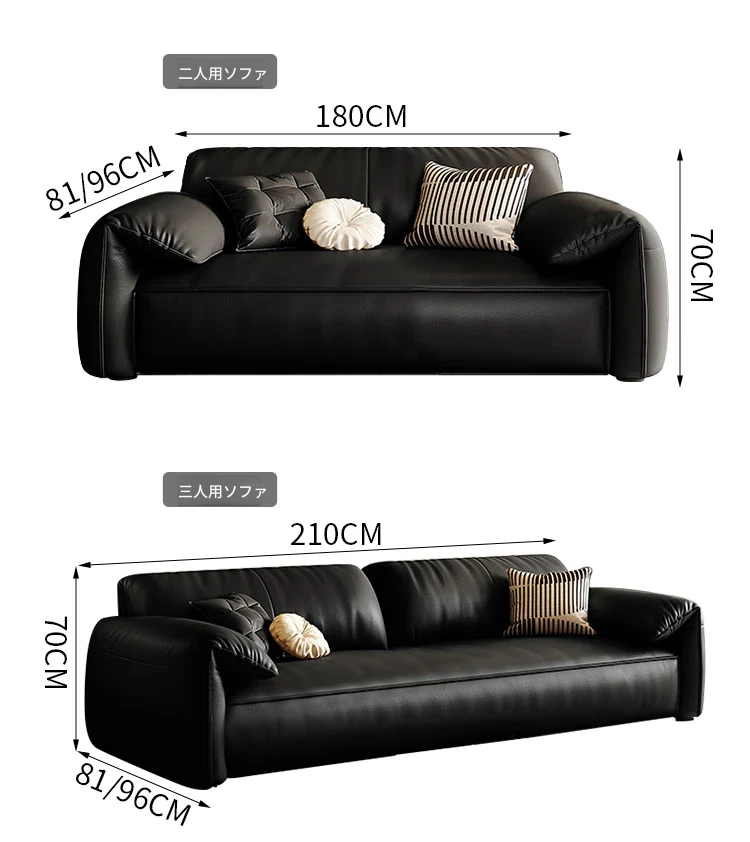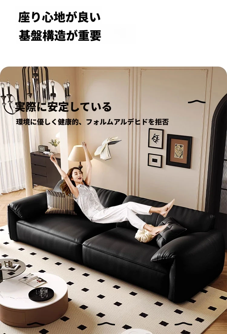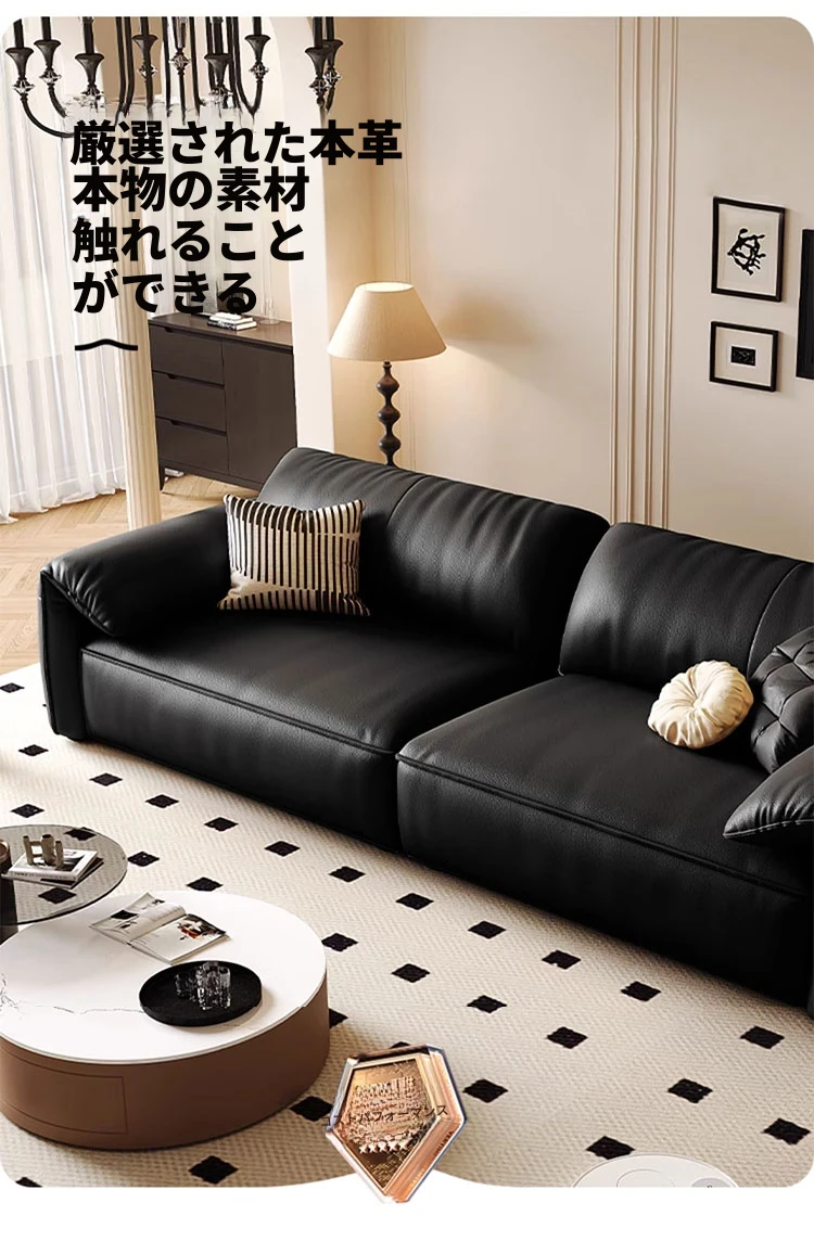 イタリアンミニマリズムの象耳デザイン!本革製のリビング用ソファ。小型住宅にも最適なモダンでシンプルな超広座面・深座りの3人掛けソファ。心地よい座り心地で、洗練された空間を演出します。