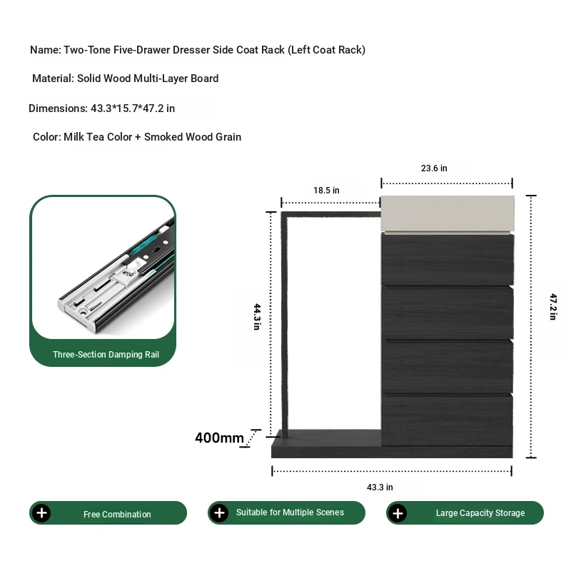 (左)コートハンガー引き出し@カーキ色+ウォールナット柄 総長1.1メートル