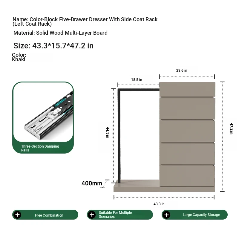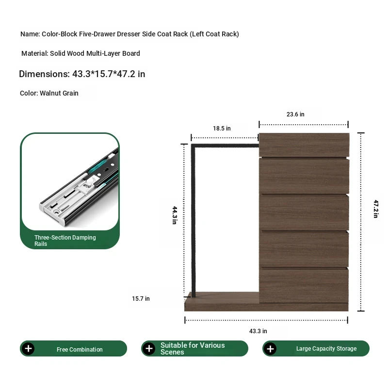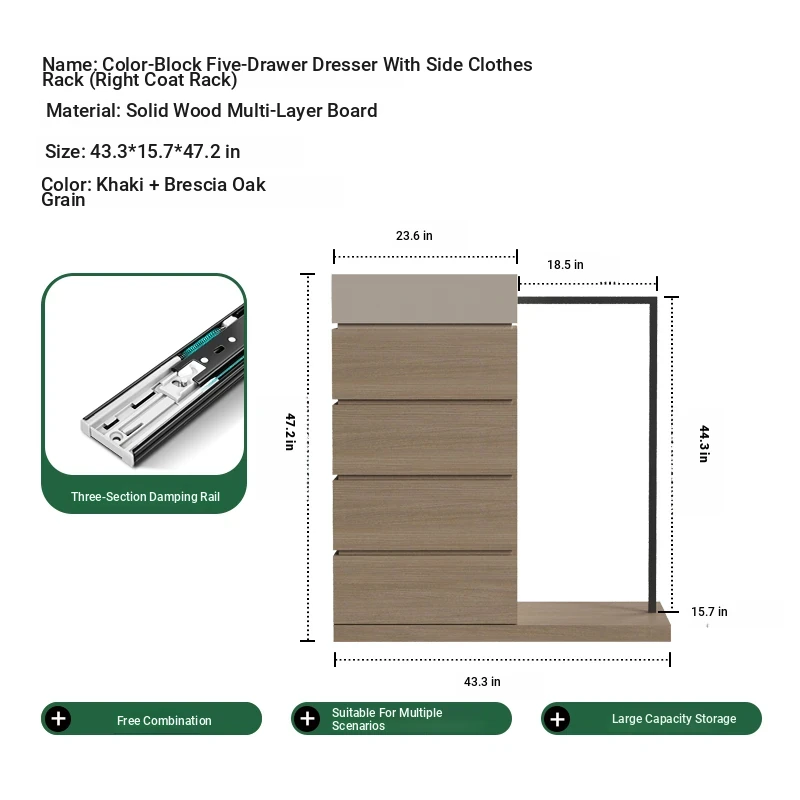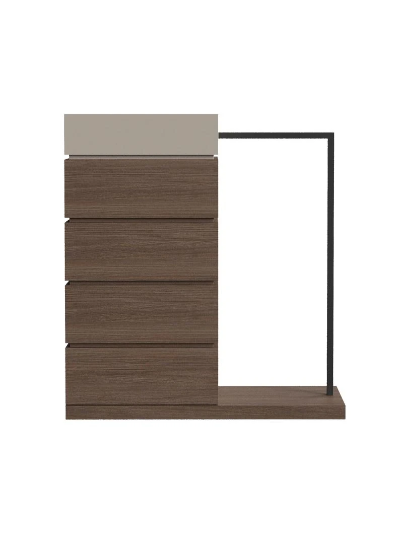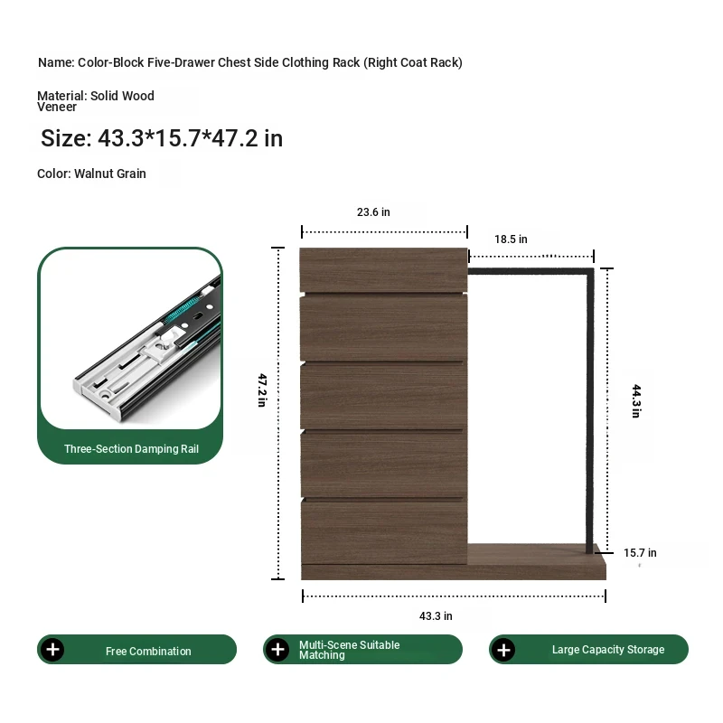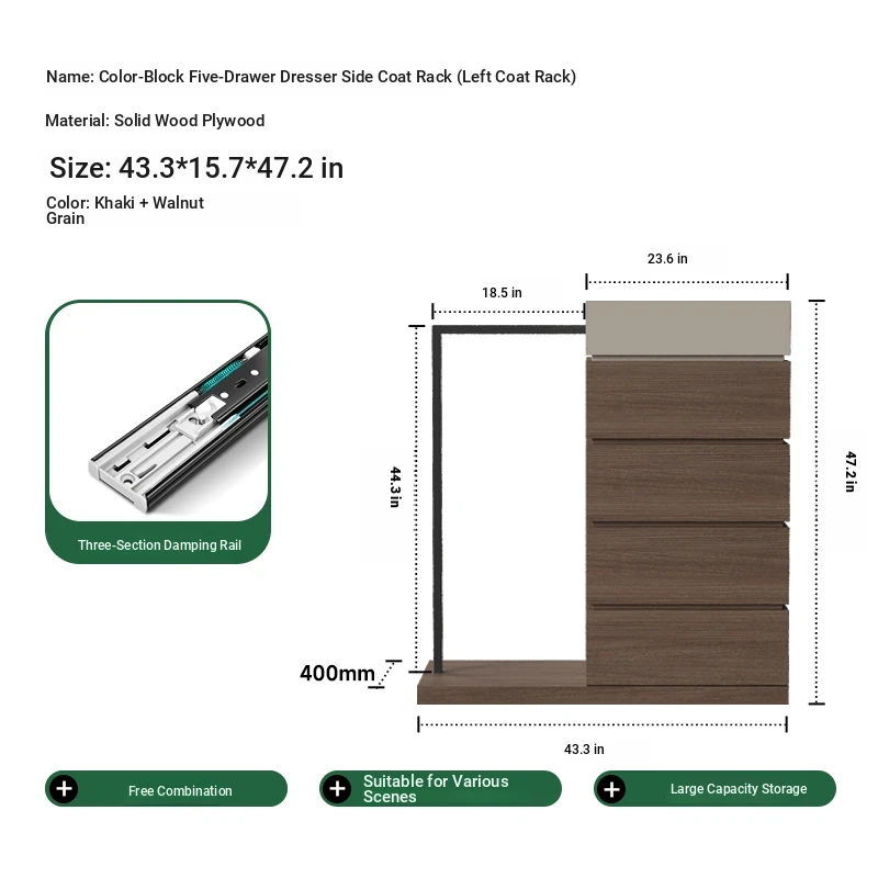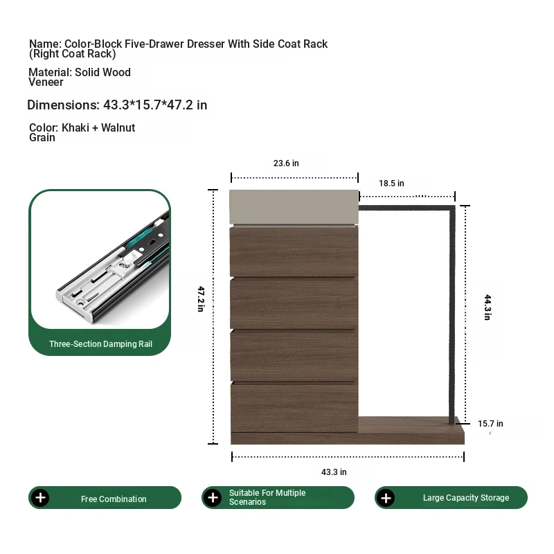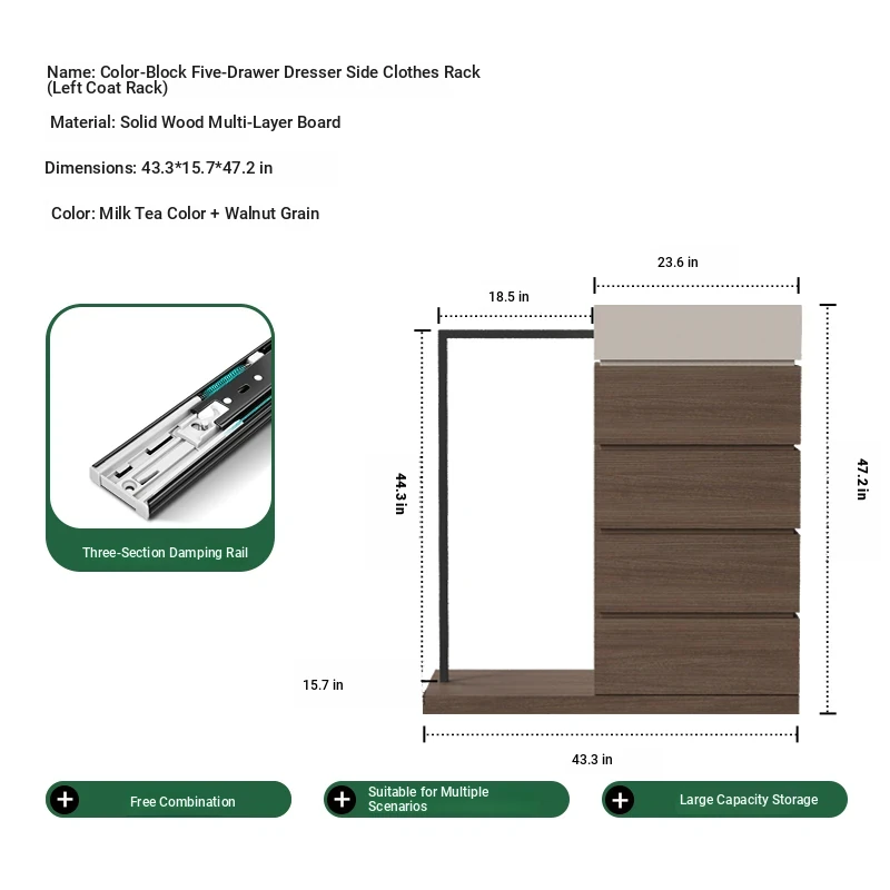 (右)コートハンガー引き出し@カーキ色+ウォールナット柄 総長1.1メートル