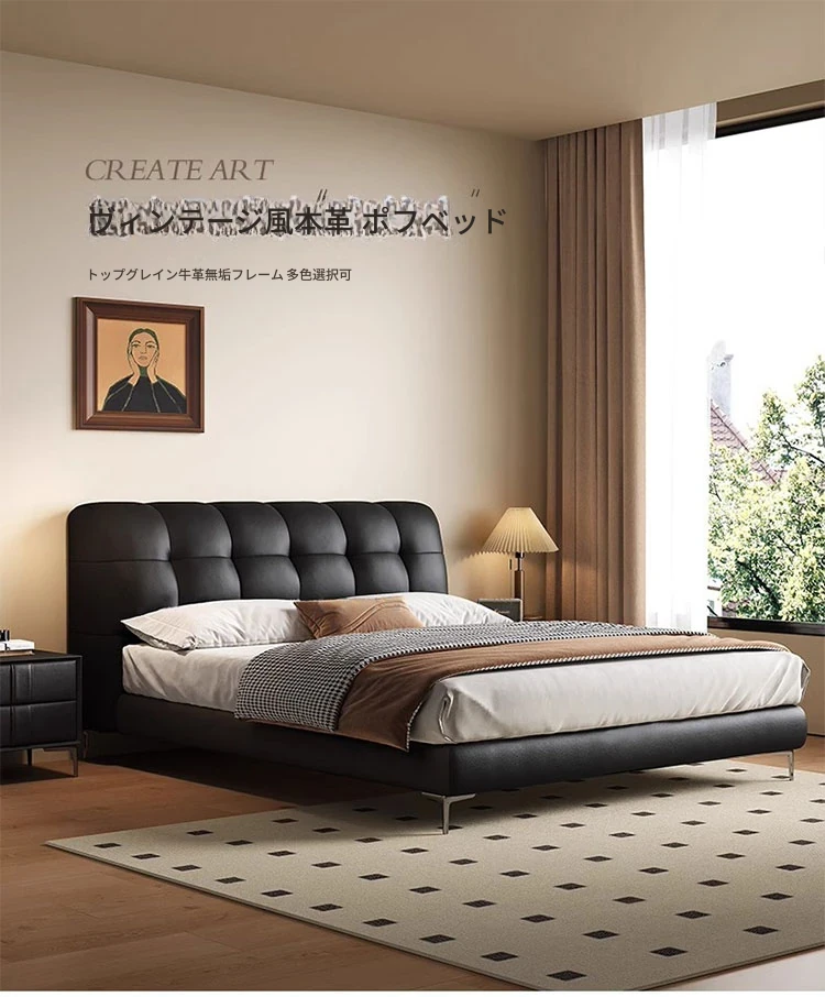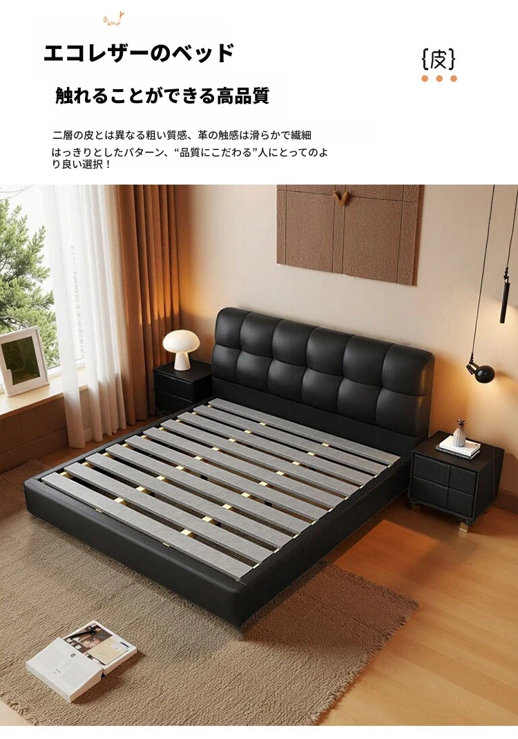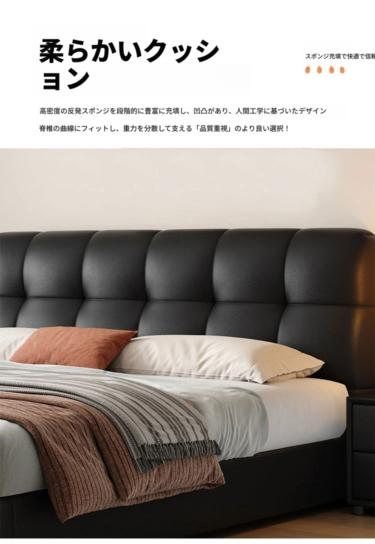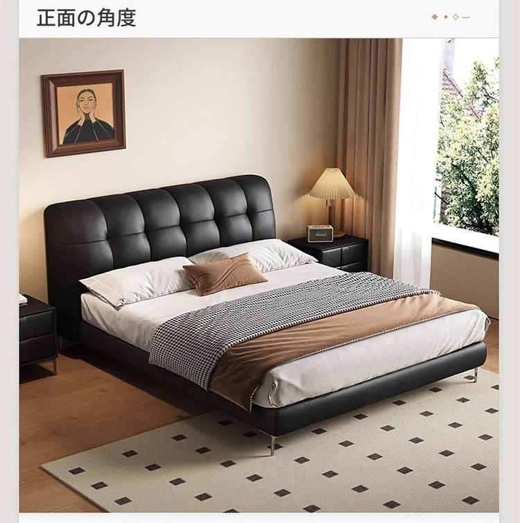 イタリアンミニマリズムのシュークリームベッド|高級感あふれるダブルベッド(1.5m)|本革仕上げのモダンシンプルソフトパッケージベッド|主寝室にぴったりな洗練されたデザイン!