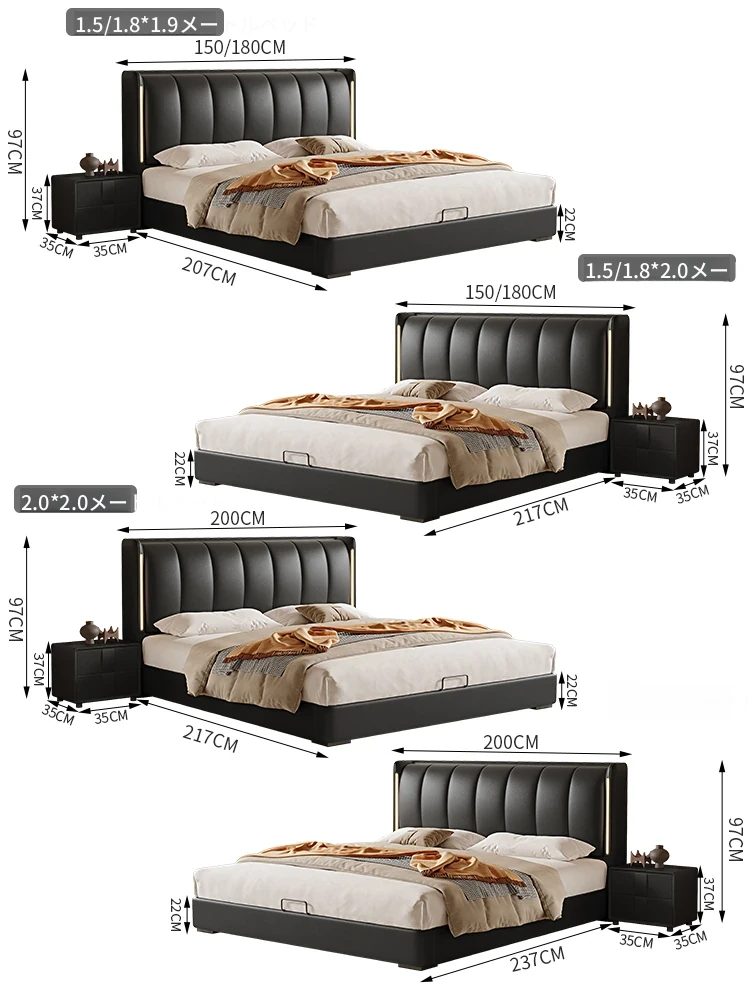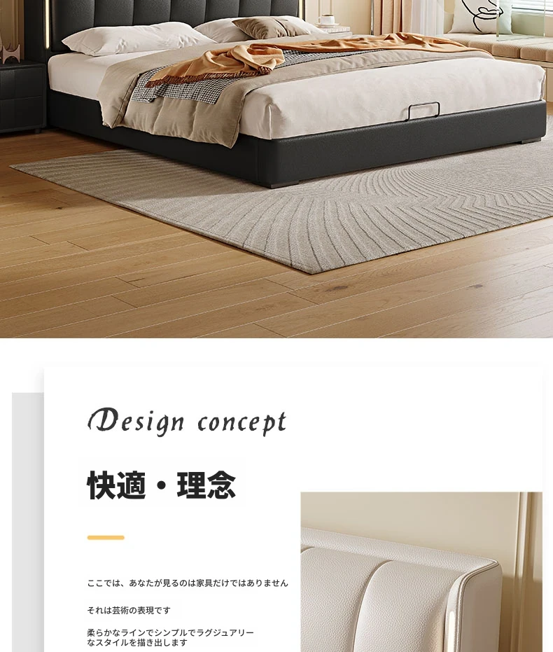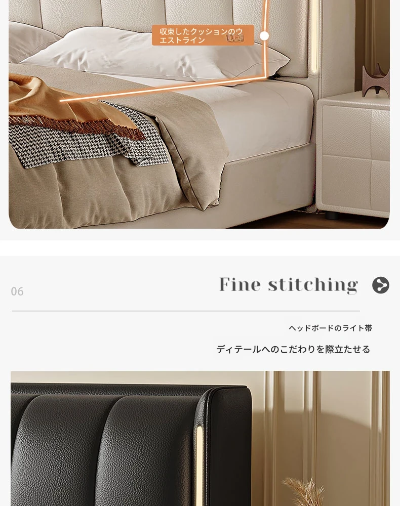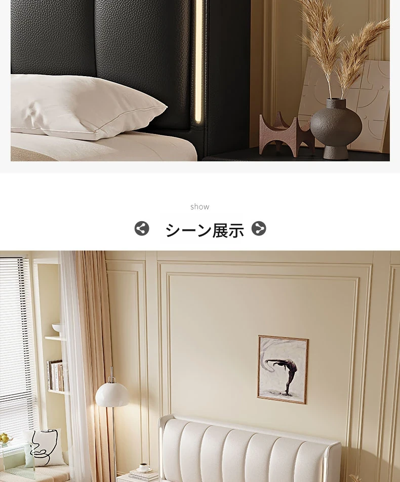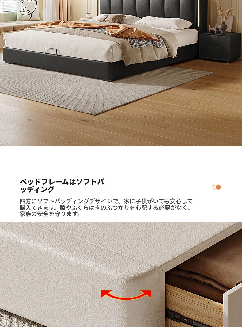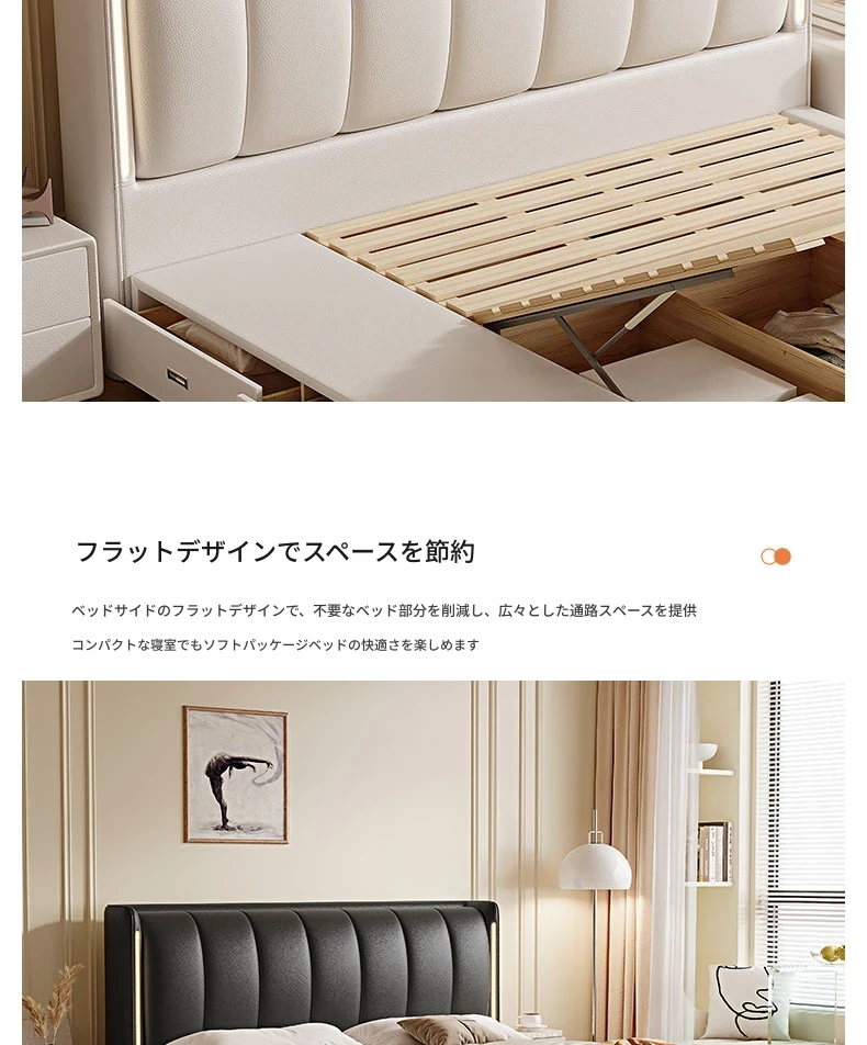 クリーム風ダブルベッド モダンシンプルな本革製 高級感あふれる無垢材ベッド 寝室用ソフトパッケージ婚礼ベッド LEDライト付き