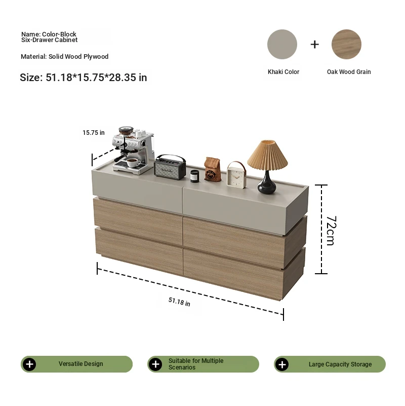 1.3メートル6引き出しチェスト@カーキ色+オーク木目