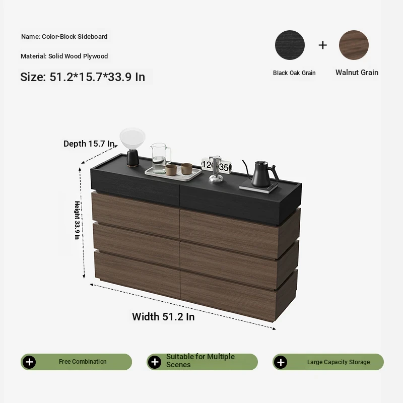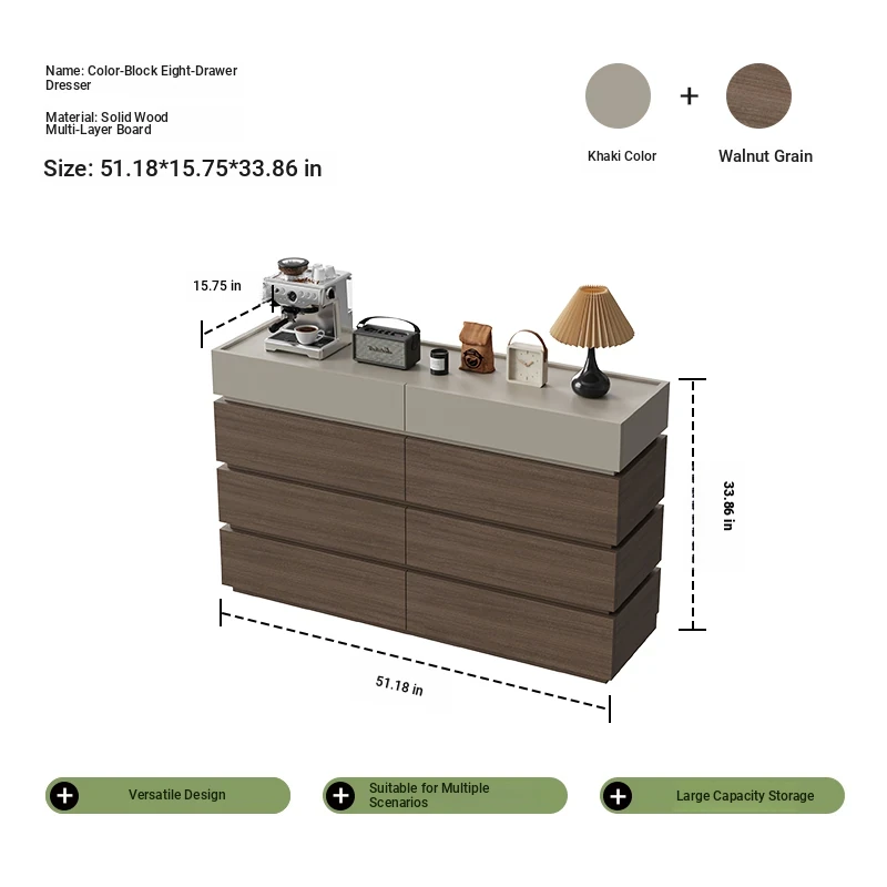 1.3メートル8引き出しチェスト@カーキ色+ウォールナット木目