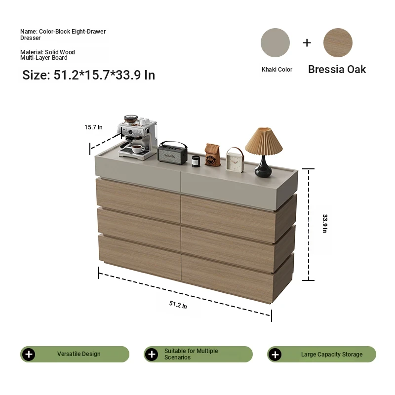 1.3メートル8引き出しチェスト@カーキ色+ブレシアオーク木目