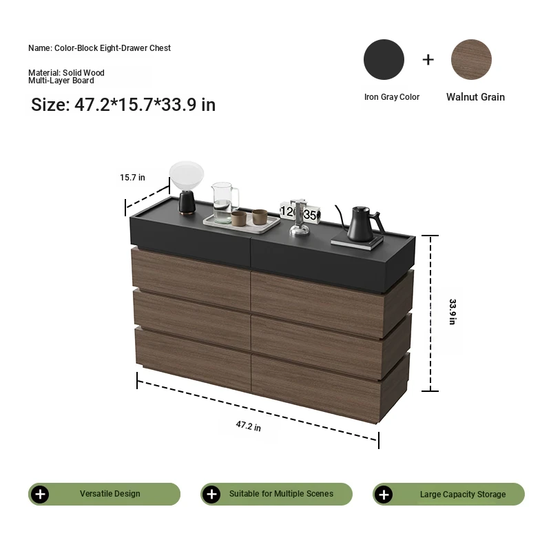 1.2メートル8引き出しチェスト@アイアングレー+ウォールナット木目