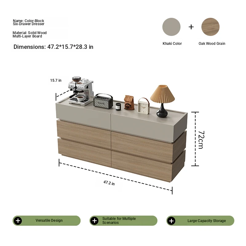 1.2メートル6引き出しチェスト@カーキ色+オーク木目