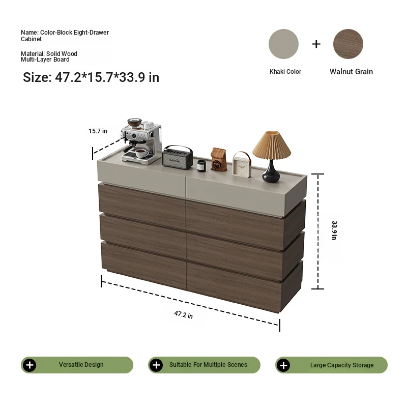 1.2メートル8引き出しチェスト@カーキ色+ウォールナット木目