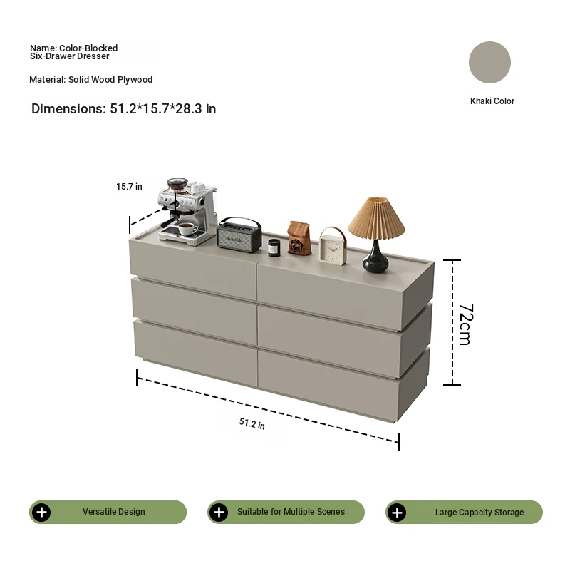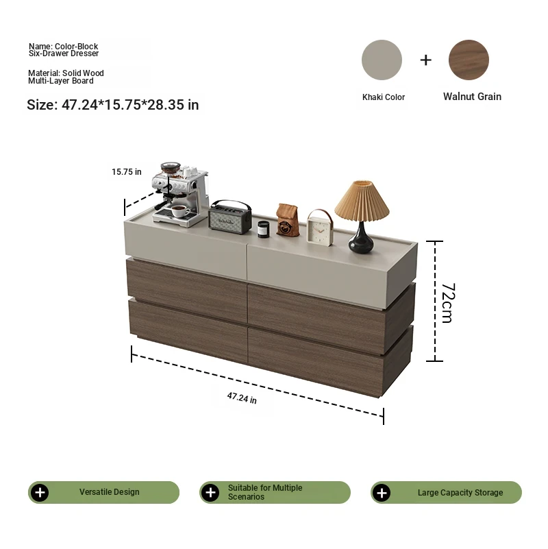 1.3メートル6引き出しチェスト@カーキ色+ウォールナット木目