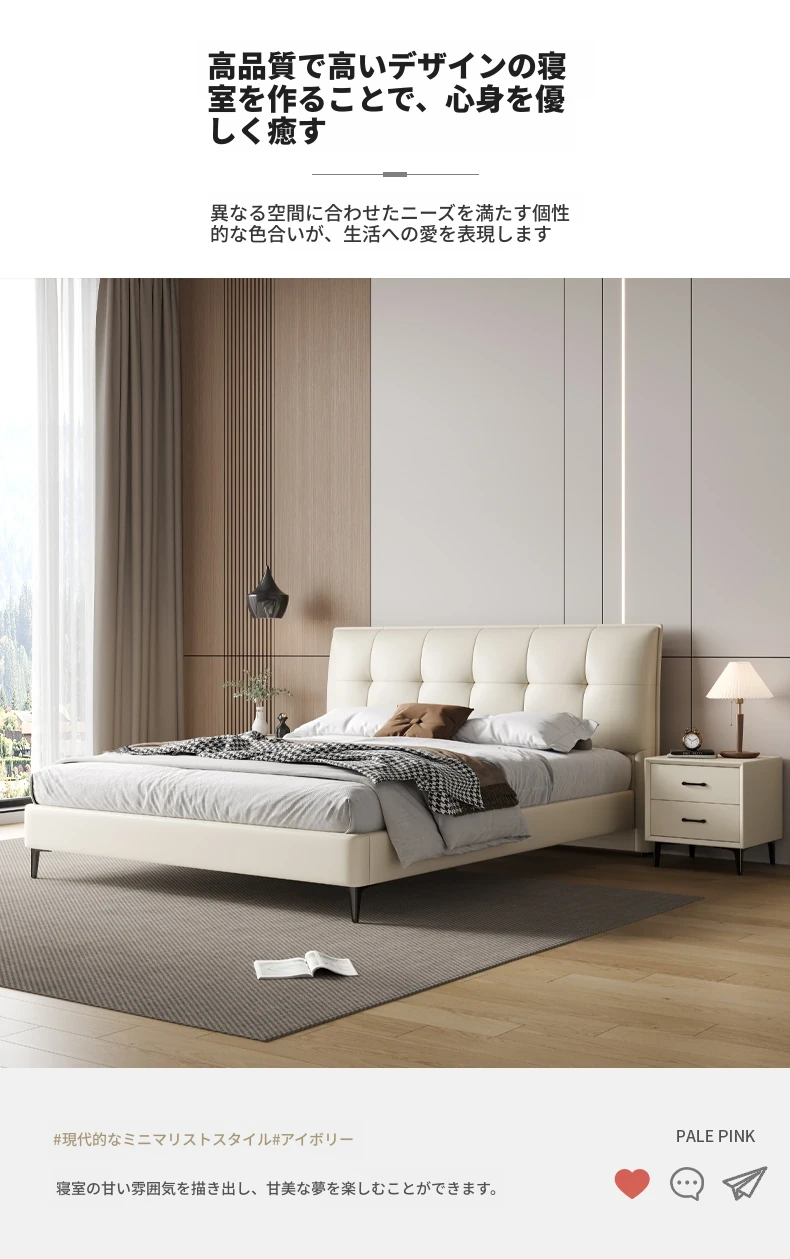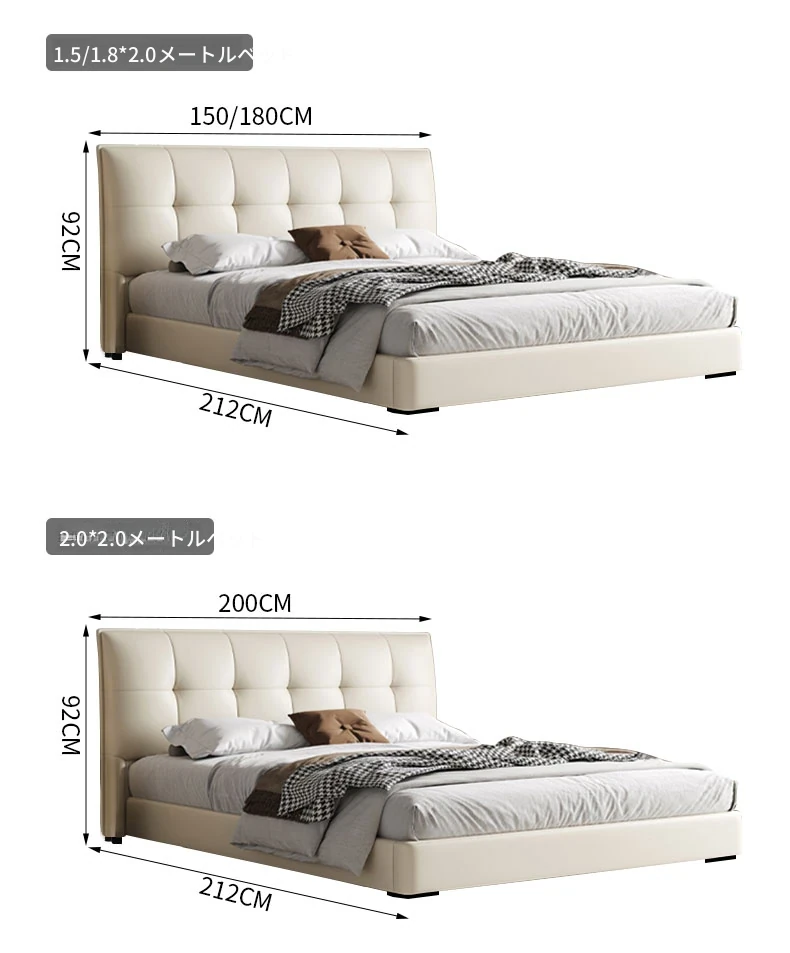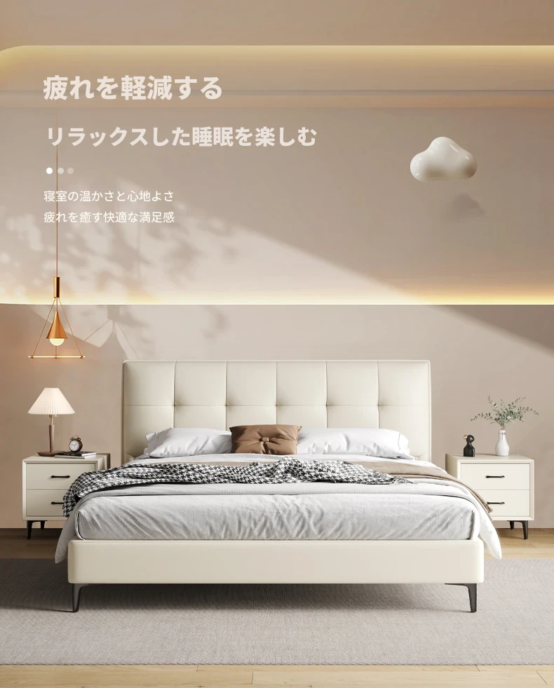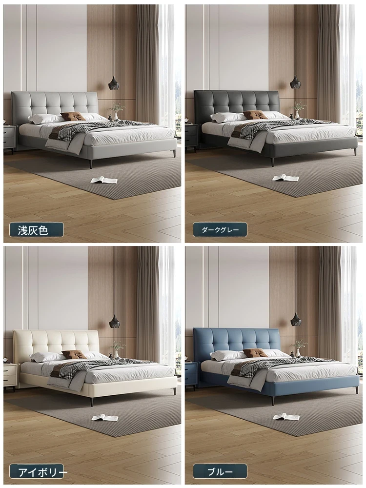 モダンでシンプルなフレンチクリーム風ダブルベッド - 高級感あふれる本革製、主寝室に最適!柔らかなパッキングデザインで、1.5mのベッドサイズ。贅沢なひとときをお届けします。