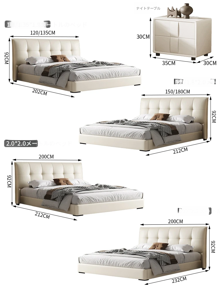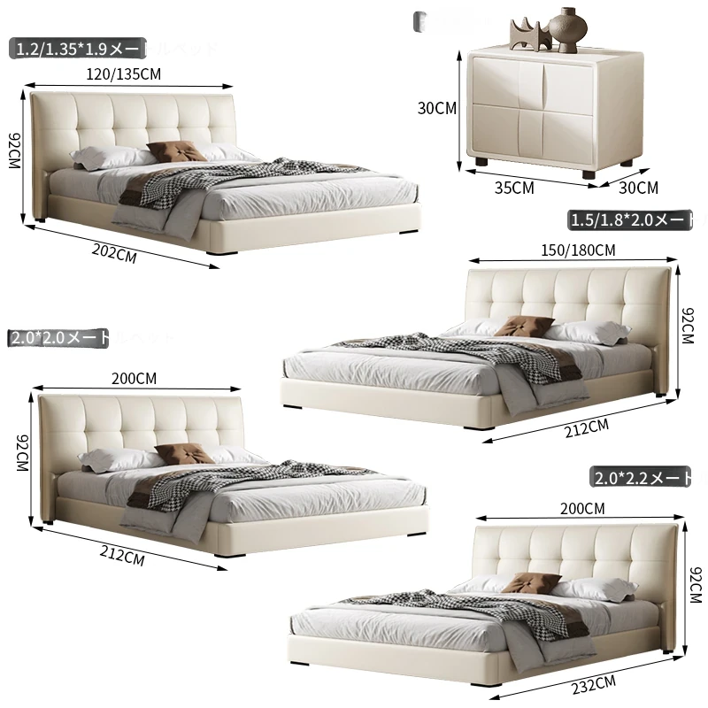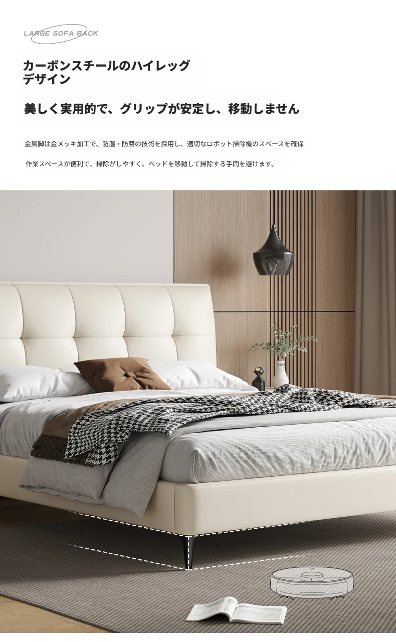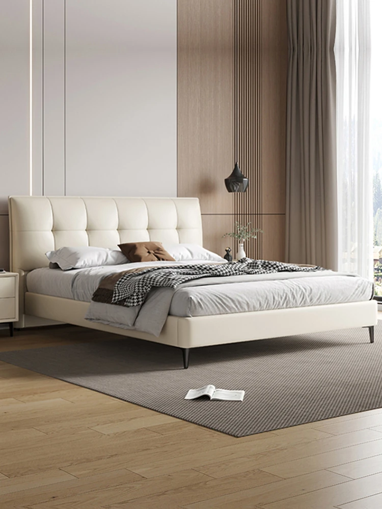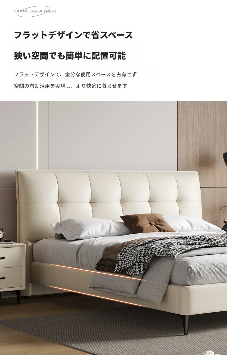 モダンでシンプルなフレンチクリーム風ダブルベッド - 高級感あふれる本革製、主寝室に最適!柔らかなパッキングデザインで、1.5mのベッドサイズ。贅沢なひとときをお届けします。